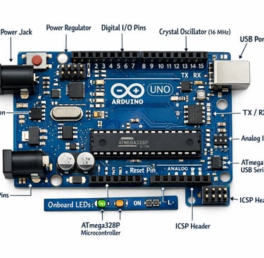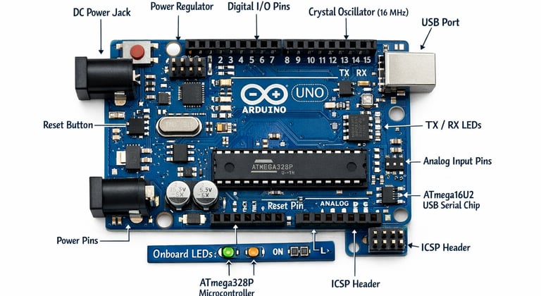 The Brain: ATmega328P. This 8-bit micro controller is the "Heart" of the operation. It performs all the computational and arithmetic work, executing your code one line at a time with Slow and Deliberate precision.